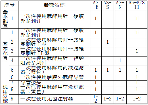 AS-N是由一次性使用麻醉用針--神經(jīng)阻滯穿刺針、一次性使用麻醉用過濾器--藥液過濾器、一次性使用無菌注射器、一次性使用無菌注射針、一次性使用低阻力注射器、橡膠醫(yī)用手套、消毒液刷、手術(shù)巾、脫脂紗布組成。